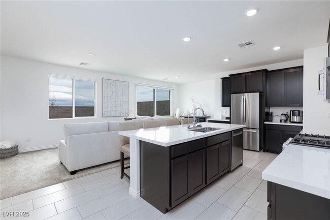 FULLY FURNISHED & MOVE-IN READY! Beautiful modern home on a cul-de-sac in a newer community with no HOA and rare long driveway. Features include open layout, 9’ ceilings, stainless steel appliances, extra fridge in garage, 80†TV, keyless entry,... and Kinetico soft/filtered water system. Upstairs has 3 bedrooms with king, queen, full, and twin beds, 2 desks for work-from-home, and a new washer/dryer. Private lot with only one neighbor, Las Vegas Strip views from backyard and mountain sunsets from master deck. Security system includes 4 Ring cameras (front, driveway, side, backyard). Quiet neighborhood near Sierra Vista High School, park, 215 freeway, Durango Resort, and airport. No pets due to carpeted floors. Come see this stunning home today!