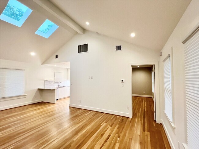 Elegant recently renovated 1/1 garage apartment w/ studio or garage space downstairs across from Menil Park! Many custom details throughout,Bright living area with vaulted ceilings and skylights,beautiful white oak hardwood floors,lots of natural light,kitchen features quartz countertops,stainless steel appliances and undercabinet lighting,bedroom features recessed lights and good closet space,downstairs functional living space may be used as a studio / study or garage parking,very unique garage apartment in a one of kind location!! MLS# 98959999