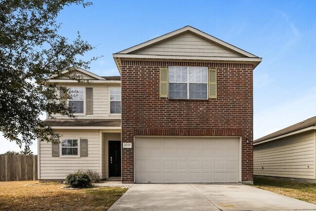 Don't miss the opportunity to move into this two-story rental home with an attached garage in Spring, Texas. A spacious living room with wood-look laminate flooring and a ceiling fan welcomes you inside. Follow the back door to find a spacious brick... patio in the fenced yard behind the home. A pass-through window connects the dining area with the kitchen, which comes fully equipped with modern appliances, black granite countertops, and plenty of all-white cabinet space. Highlights of the upstairs primary suite include cozy neutral-colored carpeting and a walk-in closet. You'll love having an oversized tub and a walk-in shower in the adjoining bathroom.